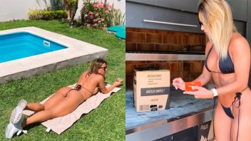 En un video que publicó en su cuenta de Instagram, se puede ver a la influencer relajada tomando sol en bikini y zapatillas, con un verde jardín de fondo y una pileta. Luego, la conductora se levanta para dirigirse a la parrilla.