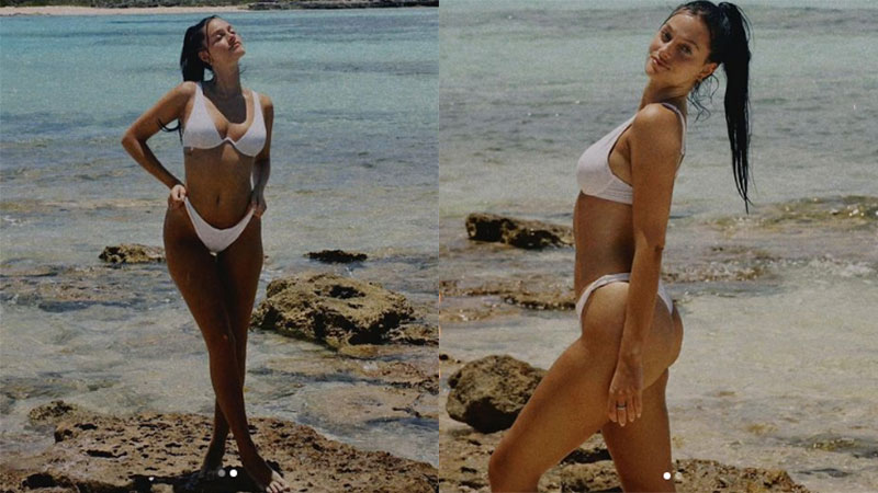 Los jóvenes disfrutaron de un viaje en yate sobre las cristalinas aguas y ella se fotografió luciendo una bikini blanca muy particular.