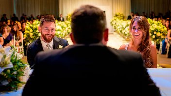 En la foto se pueden ver las manos entrelazadas de Messi y Antonella con las alianzas puestas y la fecha de casamiento en números romanos tatuada en los dedos anulares: "XXX-VI-XVII por 30-6-17".