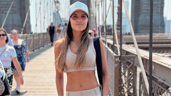 Desde el Brooklyn Bridge en Nueva York, Estados Unidos, la novia de Julián Álvarez se lució con un equipo de dos piezas en tonos beige: top, minifalda y cap.