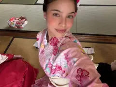 Durante su estadía, la artista se animó a vestir un kimono de seda rosa con detalles florales, acompañado por un obi beige y un delicado arreglo floral en el cabello. El look se completó con un maquillaje natural que resaltó la estética tradicional japonesa.