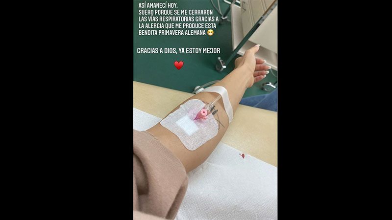 A través de sus historias de Instagram, la modelo compartió una foto de su brazo mientras le daban suero y escribió: “Así amanecí hoy. Suero porque se me cerraron las vías respiratorias gracias a la alergia que me produce esta bendita primavera alemana”.