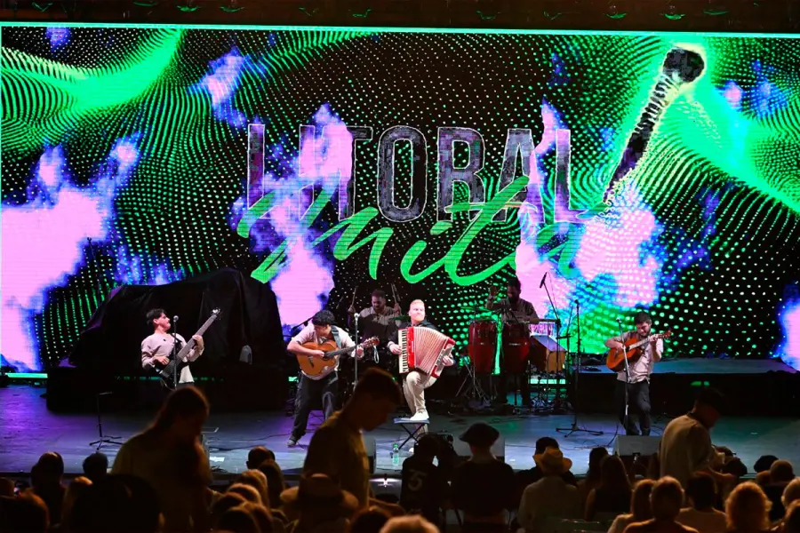 Desde los primeros acordes, con acordeón, guitarras, bajo y batería, Litoral Mitá marcó el pulso de una presentación pensada para celebrar la música del litoral. La apertura llegó con “La Fiesta Grande”, seguida por “Puerto Tirol”, popularizada por Los Nocheros, que fue coreada por el público presente.