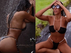 En una de las imágenes, capturada en lo que parece ser el baño de un exclusivo alojamiento, Floppy posó bajo el agua de la ducha, de espaldas y con una microbikini animal print que resaltaba su figura.