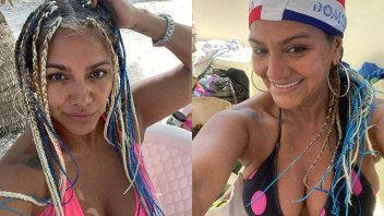 La cantante se hizo trencitas en toda la cabeza, con detalles de color azul y rubio platino. En contraste con una espectacular bikini negra y fucsia, que resalta su bronceado caribeño.