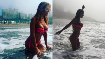 En la primera imagen se la ve de rodillas en el mar mirando el agua y luciendo una bikini rosa con negro, y en las siguientes dos fotos está de pie caminando y jugando con el agua, con el paisaje de "la Feliz" de fondo.