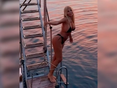 La famosa posó desde una embarcación con un traje de baño negro que contó con un corpiño triangular y una bombacha colaless con tiras ajustables. Las postales.