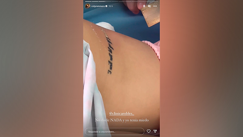 En el clip se puede ver el antebrazo de Coti sobre una camilla mientras una máquina láser comienza a aplicar su técnica sobre el tattoo de la participante del Bailando 2023. “I will not let go...”, que en inglés quiere decir “Yo no voy a dejar...”, dice el tattoo que Romero está intentando remover.