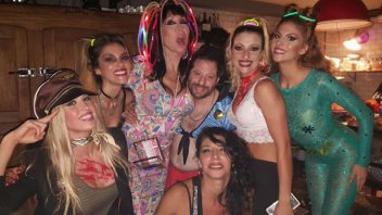 El ex de Vicky Xipolitakis aparece disfrazado con una pollera roja y un top celeste anudado a la cintura, mientras que Moria luce tiras de leds en el pelo y un disfraz "de yo misma".