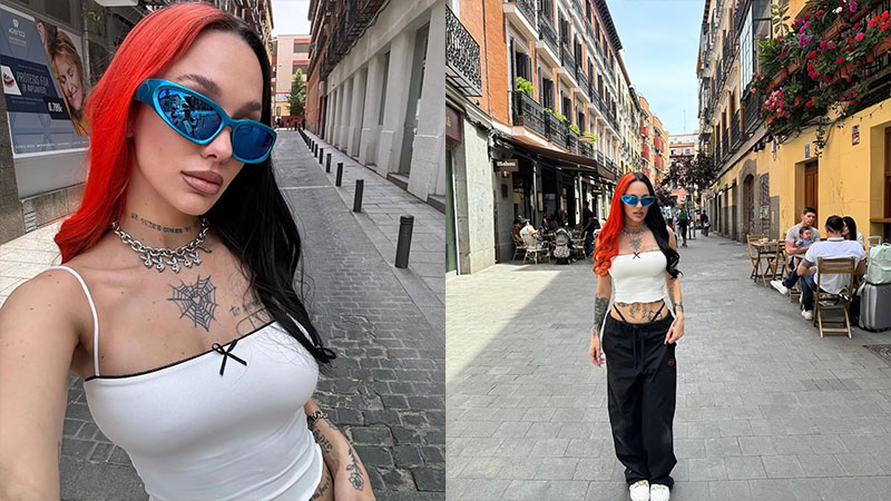 Desde Madrid, la cantante se fotografió con un pantalón que dejó su lencería al descubierto. El broche de oro fue el cabello bicolor, negro de un lado y naranja del otro, peinado con raya al medio y ondas en las puntas.