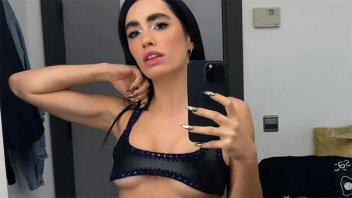 Se hizo una selfie frente al espejo mostrando un conjunto de lencería: se trata de una dupla negra confeccionada en una tela con efecto cuero. El corpiño es rectangular, asimétrico, diminuto y underboob, por lo que deja mucha piel y parte de sus pechos al descubierto. Además, la pieza cuenta con terminaciones cosidas en un hilo de lúrex violeta oscuro y breteles del mismo material. La bombacha, en tanto, es diminuta, colaless y de tiro bajo, detalla el portal Tn Estilo.