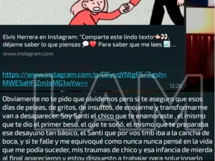 “Obviamente no te pido que olvidemos, pero sí te aseguro que esos días de peleas, de gritos, de insultos, de enojarme y transformarme van a desaparecer”, le dijo en otro mensaje, intentando convencerla de seguir adelante en la relación pese al calvario que le estaba haciendo sufrir. Además, matizó su mensaje apelando a los mejores recuerdos de su relación. “Soy Santi, el chico del que te enamoraste, el mismo que te dio el primer beso, el que te soñó, el mismo que te preparaba ese desayuno tan básico, el Santi que por vos también iba a la cancha de Boca”, dijo.