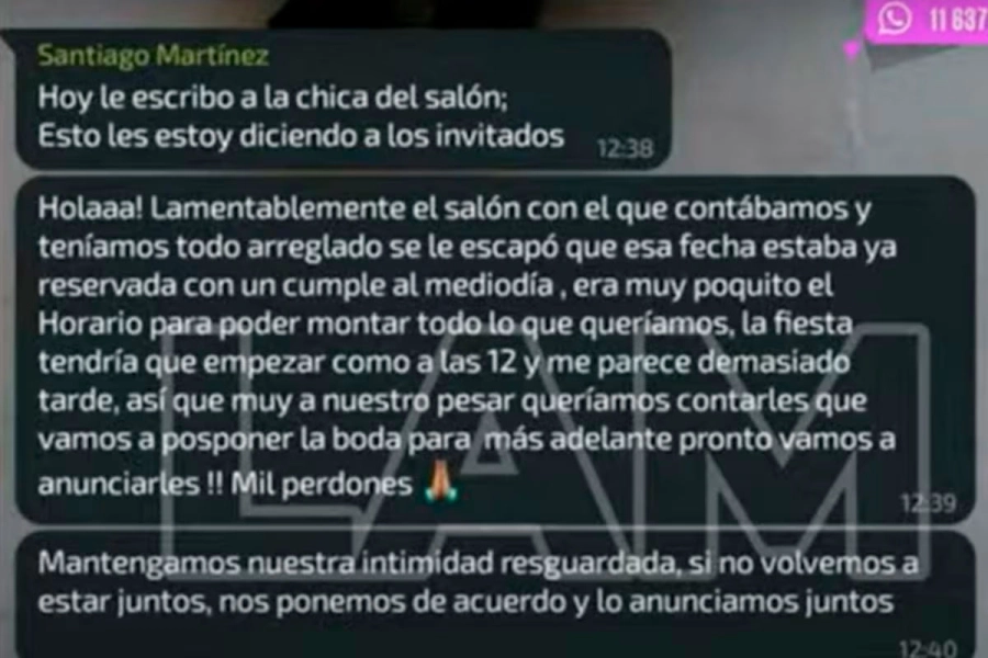 En uno de los primeros chats presentados en el ciclo, Martínez le pedía discreción a la joven sobre la violenta discusión de la que ella fue víctima, ya que esperaban ser convocados para el Bailando y le contaba que ya tenía una excusa idónea para justificar la postergación de su boda. “Esto les estoy diciendo a los invitados: ‘Hola, lamentablemente el salón con el que contábamos y teníamos todo arreglado, se le escapó que esa fecha estaba ya reservada con un cumple al mediodía. Era muy poquito el horario para poder montar todo lo que queríamos, la fiesta tendría que empezar como a las 12 y me parece demasiado tarde. Así que muy a nuestro pesar queríamos contarles que vamos a posponer la boda para más adelante. Pronto vamos a anunciarle’”, fue el texto que utilizó como excusa para maquillar la violenta realidad.