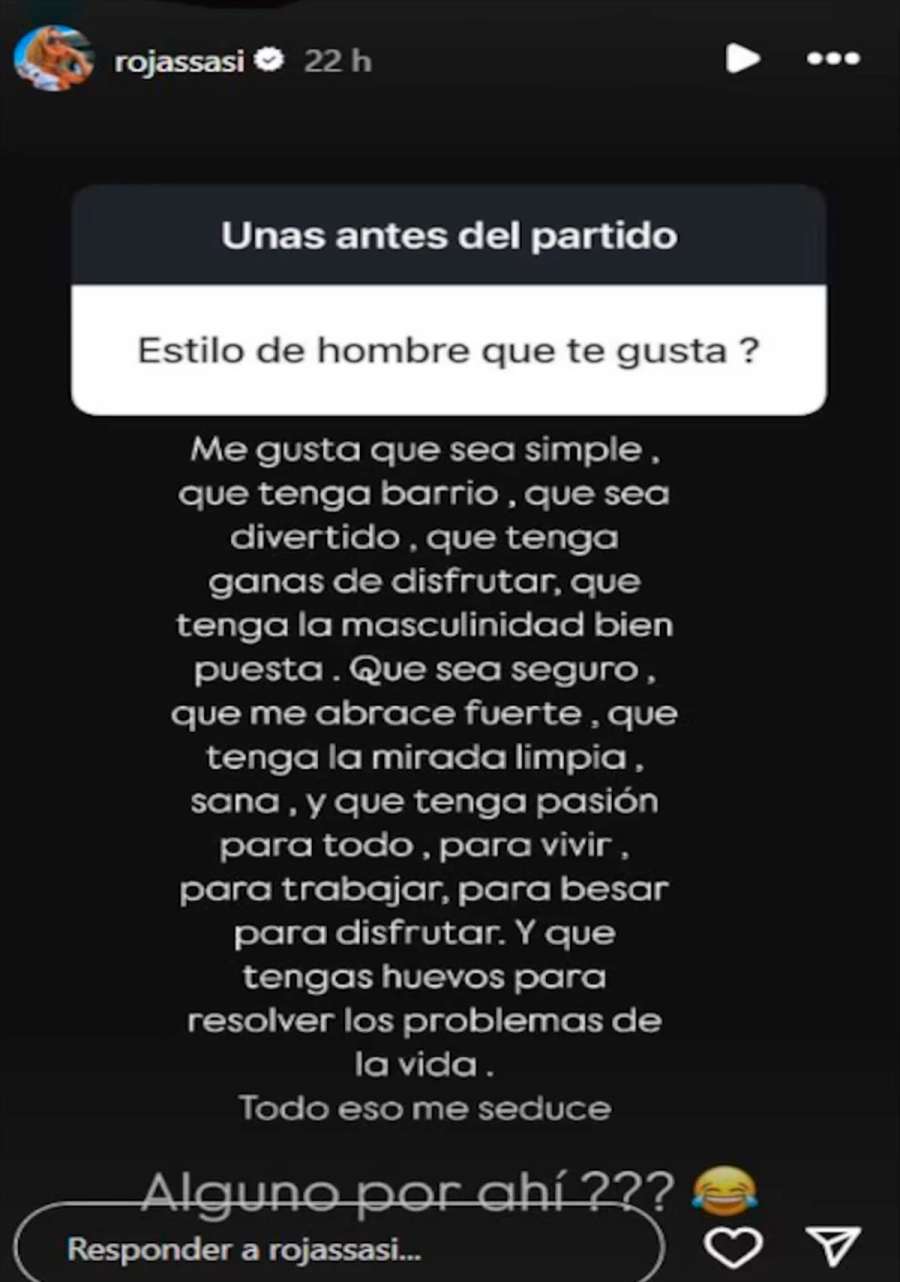 Todo comenzó cuando Rojas habilitó la clásica “cajita de preguntas” en su cuenta de Instagram. Al recibir la consulta “¿Estilo de hombre que te gusta?”, respondió sin rodeos: “Me gusta que sea simple. Que tenga barrio, que sea divertido, que tenga ganas de disfrutar y que tenga la masculinidad bien puesta”.