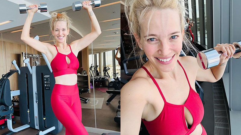 La actriz mantiene una exigente rutina de ejercicios que incluyen tanto movimientos aeróbicos como de levantamiento de pesas. Para su clase de ejercitación eligió un conjunto deportivo de calza y top en color rojo.