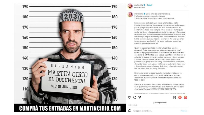 Y siguió: "Persecuciones en la calle y en redes, una horda de trolls intentando cancelarme shows y eventos, censurado en Paraguay, país al que ya no puedo entrar por esto, trabajo perdido, mi nombre manchado para siempre, y más cosas que nunca pude contar por tener esta causa abierta tanto tiempo. Un infierno que tardó tres años en resolverse pero finalmente HOY la justicia, que me investigó de piés a cabeza (literal, con allanamiento incluido) habló: confirma que soy inocente (siempre lo fui, solo que ahora tengo un papel que lo dice). No tengo nada que ver con las mentiras que se dijeron de mi".