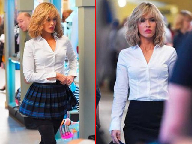 Rubia y con algunos rulos, con lentes, pollera de colegiala y camisa blanca, Megan Fox se roba todas las miradas.