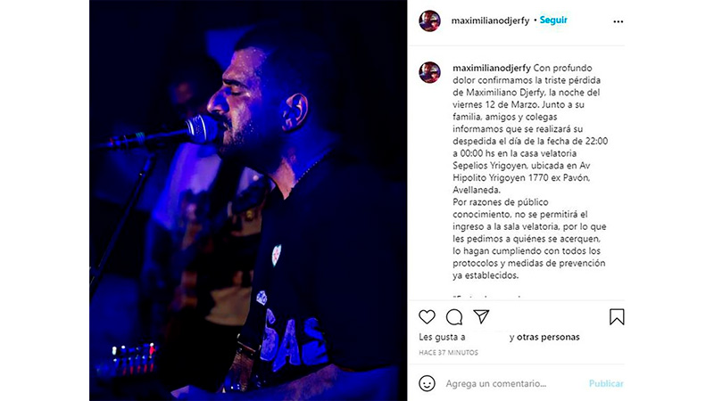 “Con profundo dolor confirmamos la triste pérdida de Maximiliano Djerfy, la noche del viernes 12 de marzo”, publicaron en el Instagram personal del músico, ratificando la triste noticia. Luego avisaron que la despedida, junto a familia, amigos y colegas, será este sábado, de 22 a 0, en una casa velatoria de la ciudad de Avellaneda. “Por razones de público conocimiento, no se permitirá el ingreso a la sala velatoria, por lo que les pedimos a quiénes se acerquen, lo hagan cumpliendo con todos los protocolos y medidas de prevención ya establecidos”, informaron, para luego cerrar el posteo con la frase: “En tus brazos descanso eternamente, en mí mente no descansa la pasión”.