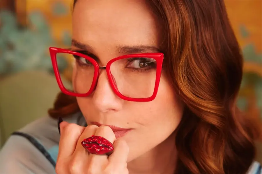 La propuesta se caracteriza por modelos de inspiración retro, marcos audaces y una paleta que incluye tonos vibrantes, como el rojo intenso que tantas veces ha marcado su estilo. La estética dialoga con el universo pin-up que la artista supo adoptar en diferentes etapas de su carrera, combinando sensualidad, elegancia y carácter.