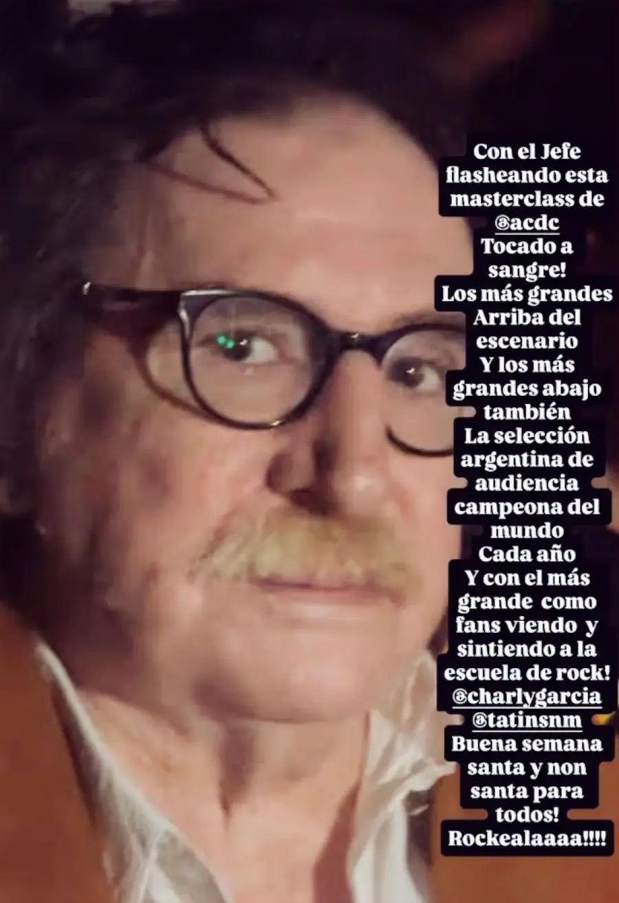 “Con el jefe flasheando esta masterclass de AC/DC”, dice el texto que acompañó al video en el que aparecen unos segundos del grupo tocando en vivo y de la mirada atenta de Charly desde la platea del estadio.