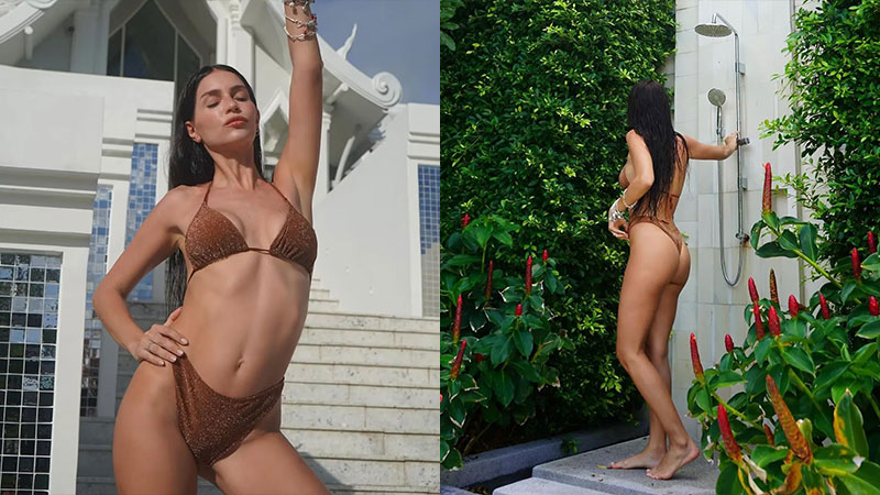 Desde la Isla de Phuket, posó en un lujoso jardín bajo una ducha con un diseño marrón de lúrex. Los brillos son uno de los indispensables de la temporada y Zaira Nara lo sabe. Además, el modelo es de corpiño triangular con breteles finos y bombacha colaless cavada, clásicos que cada verano siguen vigentes.