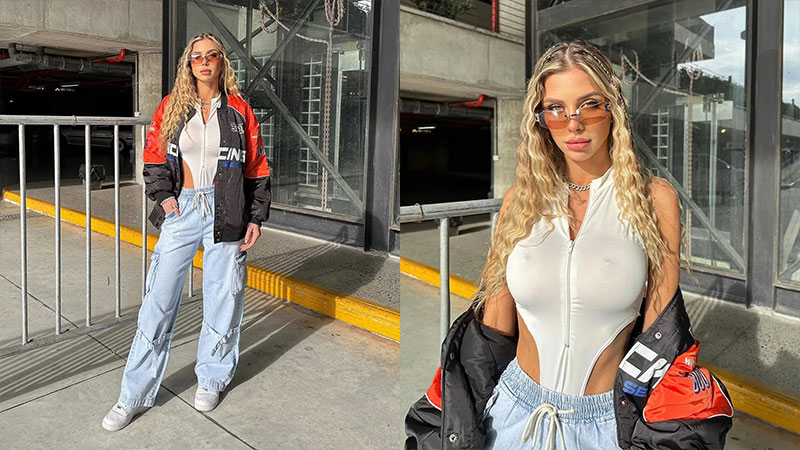 Romina Malaspina combinó una campera de estilo automovilístico con recortes en rojo fuego y negro con un body ajustadísimo blanco muy cavado. Para la parte inferior, eligió lucir un pantalón de jean estilo cargo.