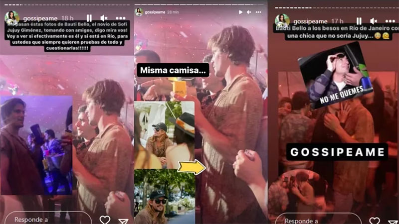 En un detallado rastreo de información, la cuenta @gossipeame recolectó la secuencia de la situación -la compartió en Instagram- y confirmó que a pesar de que en la foto del beso la cara del joven en cuestión estaba tapada por las manos de la involucrada, se trataba de él por la coincidencia de la vestimenta que lució en aquella noche.