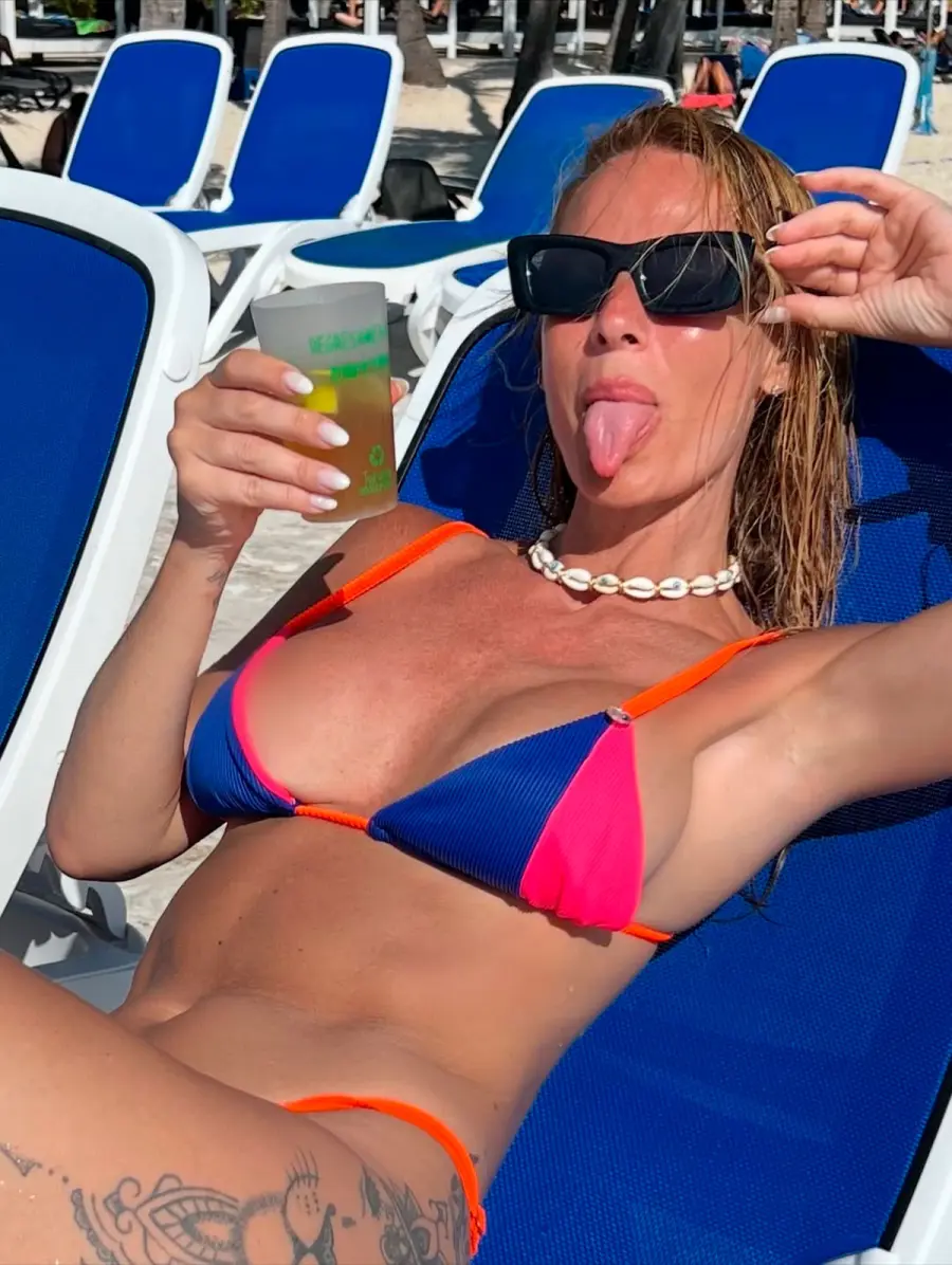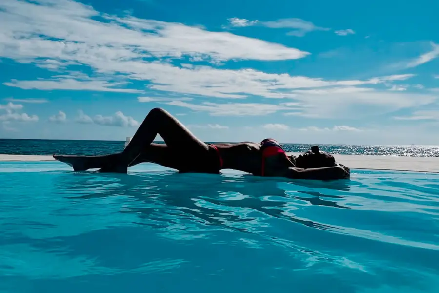 La postal fue tomada en un entorno paradisíaco, rodeado de palmeras y reposeras de playa, con luces cálidas que reflejan el atardecer tropical. La escena transmite un aire de relax y elegancia, en línea con el estilo personal de Rojas, que suele combinar moda y naturalidad en sus publicaciones.
