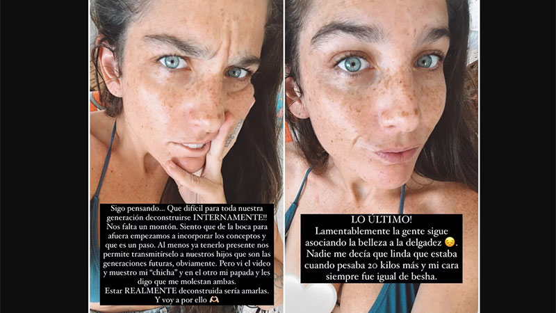 Tras asegurar que en este momento se siente muy bien, cómoda y conforme con su aspecto físico, señaló que hay cuestiones que le generan inseguridades. “Sufro y lucho con mi papada a diario en cada foto, uso todos trajes de baño tiro alto porque la panza posparto me quedó de una manera que no me gusta. Si hago así, tengo rollos. Estoy lejos de tener el cuerpo más hegemónico del mundo. Si bien estoy reflaquita y reconforme, tengo un montón de estrías”, enumeró. Y concluyó: “No se crean todo lo que ven en las redes, pues la perfección no existe”.