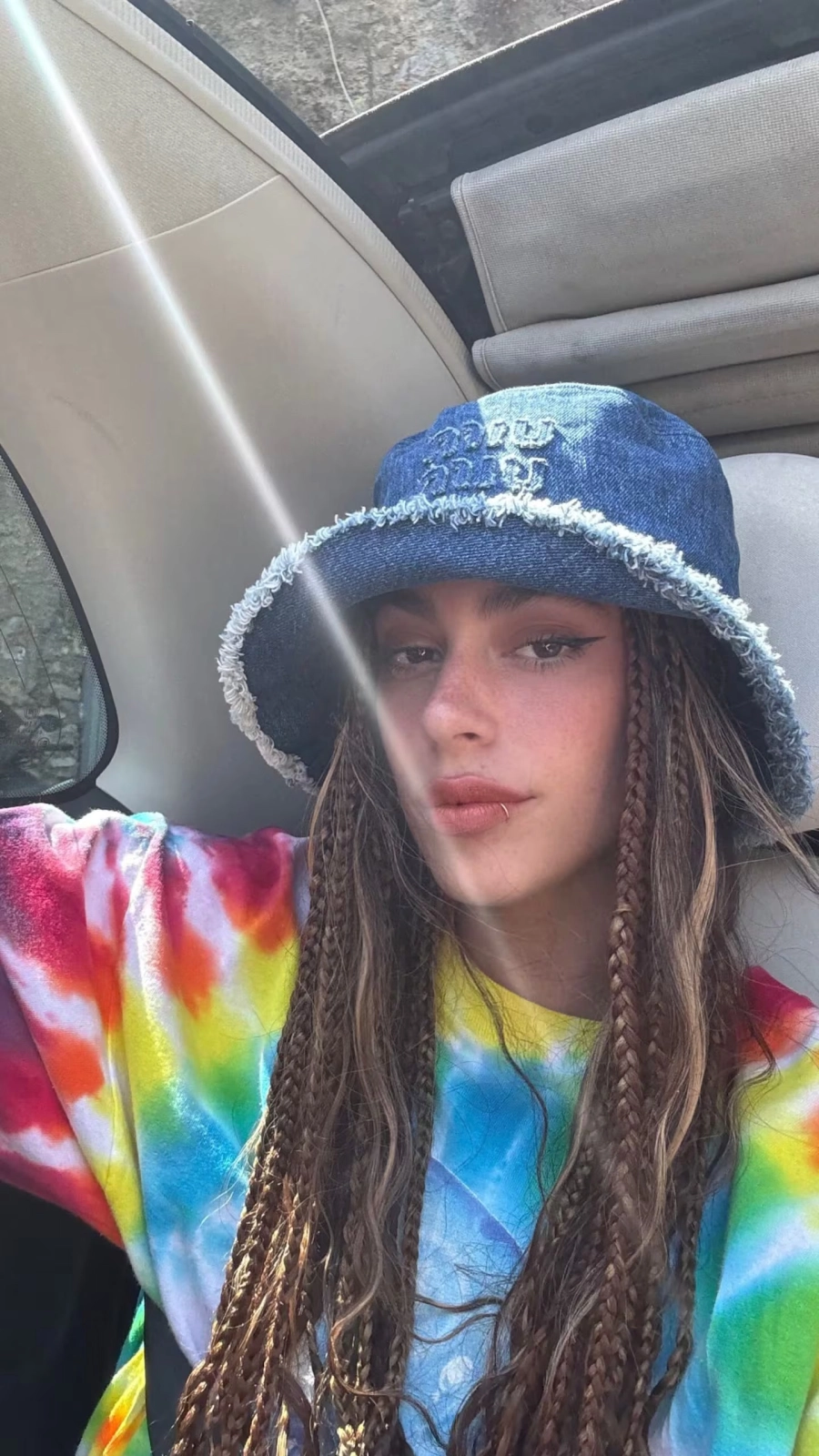 Dentro de un auto, se fotografió con las trenzas sueltas, una remera oversized de estampado batik multicolor y un sombrero piluso -uno de sus accesorios favoritos- de jean azul oscuro con flecos firmado por Miu Miu, una de sus firmas de moda preferidas.