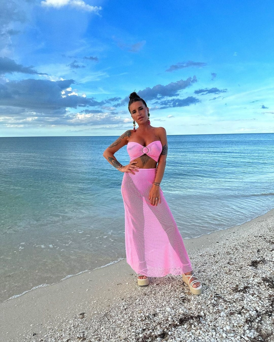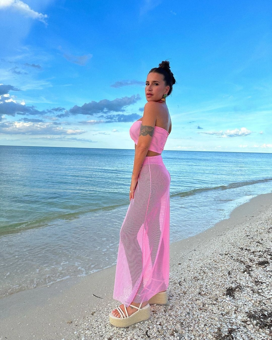 ¿Uno de los más destacados? Junto a la orilla del mar, se lució con un conjunto rosa chicle de microtop strapless fruncido en el medio con una arandela y bombacha de bikini tiro alto. Para complementar el traje de baño sumó una falda larga y translúcida de red en el mismo color, uno de los fenómenos más fuertes del 2024, que dejó a la vista la pieza inferior de la bikini.