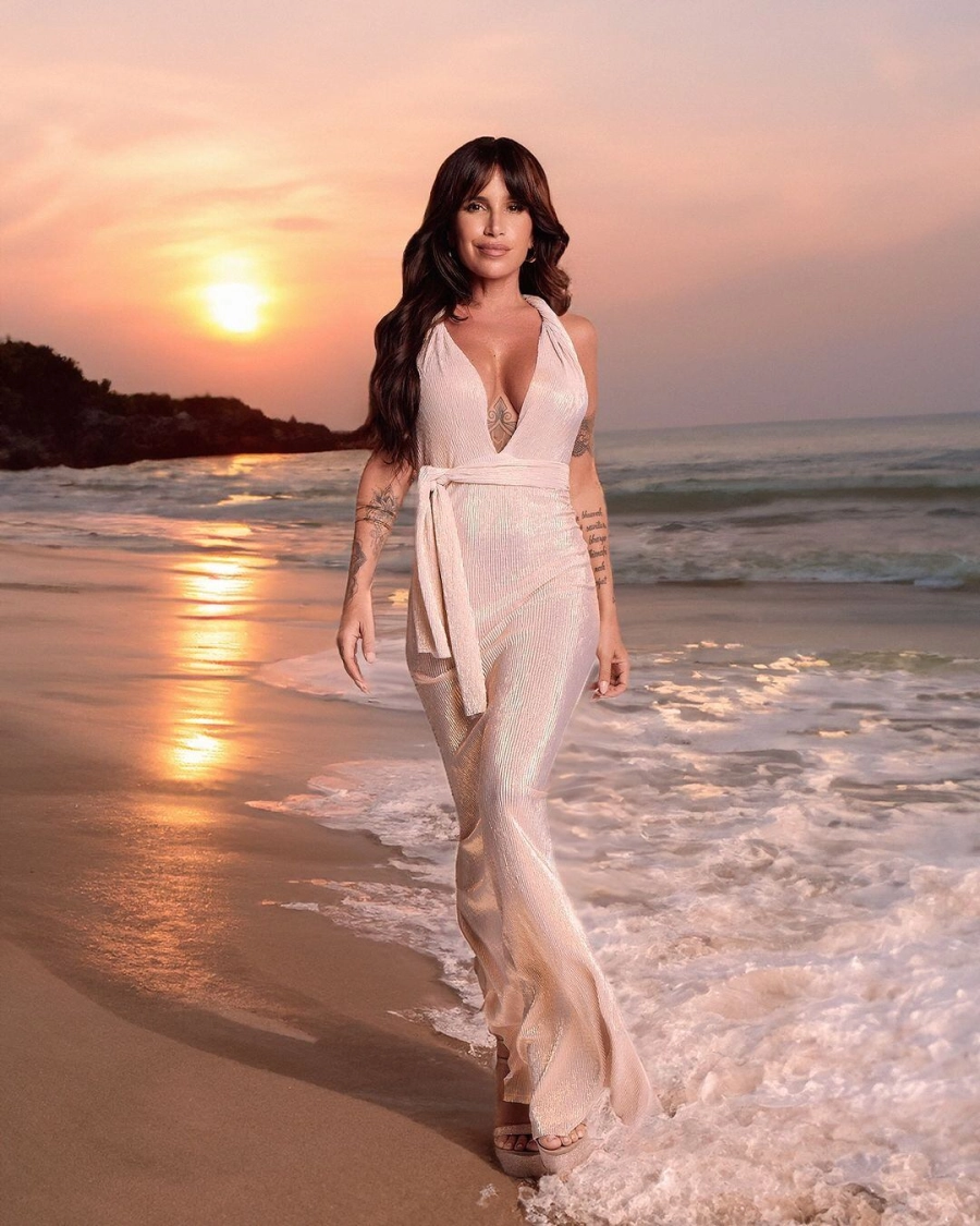 Esto no fue todo y, en el mismo escenario de playa, se lució con un vestido de gala en color rosa pálido con textura brillante. El diseño es de escote halter pronunciado, tiene un lazo que marca la cintura y falda sirena. La prenda se complementó con un par de sandalias altas color nude y el pelo suelto peinado con ondas.