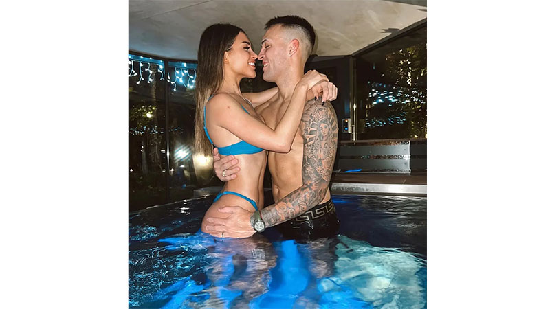 Lautaro Martínez y su mujer, Agustina Gandolfo, acapararon las miradas a partir de una foto en la que aparecen mimosos en un jacuzzi: ella lució una microbikini turquesa y él bóxer Versace.