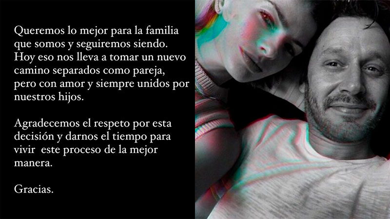 "Queremos lo mejor para la familia que somos y seguiremos siendo. Hoy eso nos lleva a tomar un nuevo camino separados como pareja, pero con amor y siempre unidos por nuestros hijos", comenzó diciendo el actor chileno.