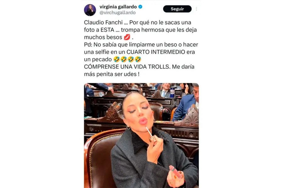 En ese marco, Gallardo fue captada por reporteros gráficos mientras permanecía en su lugar, en imágenes difundidas por la Agencia Noticias Argentinas. En las fotografías se la observa realizando gestos cotidianos, como retocarse el maquillaje y tomarse una selfie durante el desarrollo de la exposición.