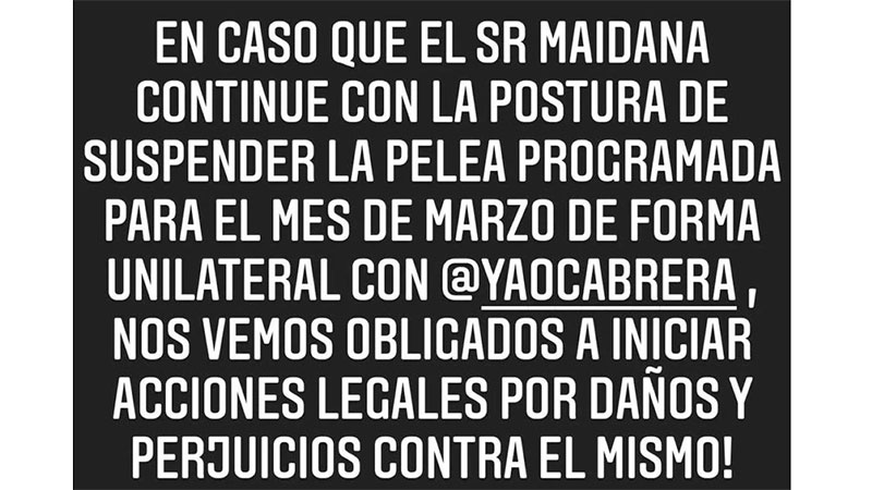 En otra publicación, el influencer aseguró que la pelea “se cancela hasta nuevo aviso”, y compartió una historia en la que su abogado ratifica que en caso de que “el señor Maidana continúe con la postura de suspender la pelea programada para el mes de marzo de forma unilateral con Yao Cabrera, nos vemos obligados a iniciar acciones legales por daños y perjuicios contra el mismo”.