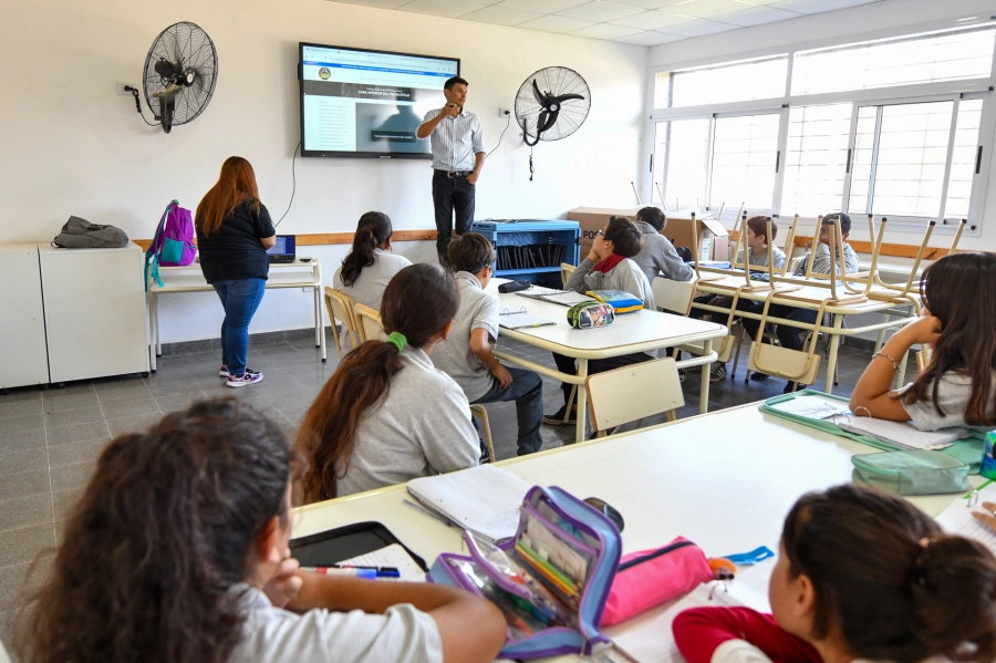 Cada alumno dispone de una notebook para actividades diarias, mientras que las pantallas digitales reemplazaron al pizarrón tradicional, generando una nueva forma de dar clases. “Estamos trabajando el patrimonio cultural de la provincia y a partir de eso, creamos un juego interactivo en la pantalla digital. Los estudiantes también pueden dibujar, presentar libros de artistas y explorar de forma creativa”, contó Julieta, profesora de Educación Artística.