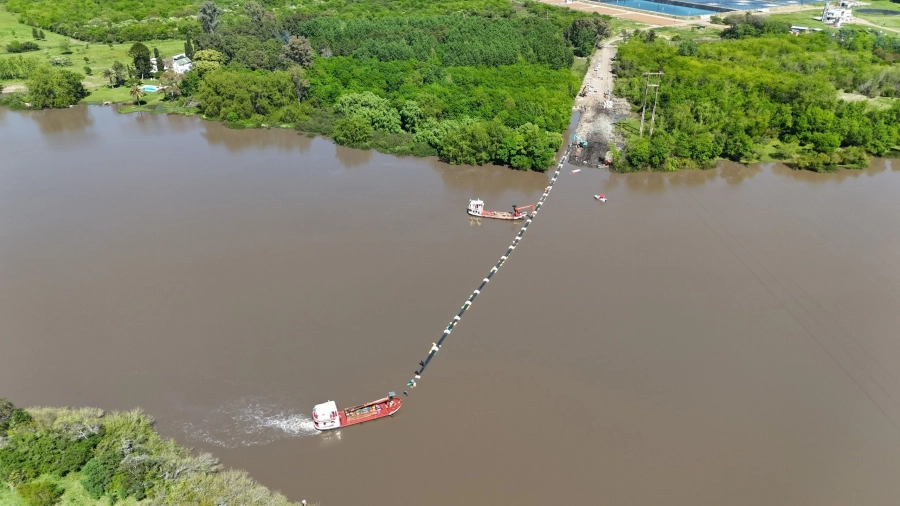 En el marco de la obra de optimización y ampliación de la planta de tratamiento de efluentes cloacales de Gualeguaychú, se realizó el hundimiento del emisario, una tubería de gran diámetro que transporta las aguas residuales tratadas hacia el río y las dispersa de forma controlada.