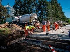 Continúa la obra de construcción y pavimentación con hormigón del ingreso para tránsito pesado en Pueblo Brugo, departamento Paraná. Se trata de 1,2 kilómetros de extensión, de los cuales se lleva ejecutado un 77 por ciento.