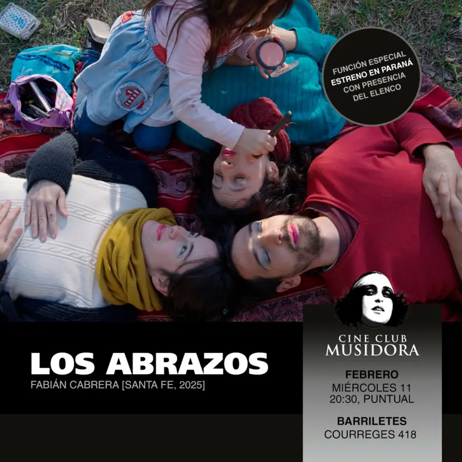 Cine Club Musidora invita al estreno en Paraná de “Los abrazos”, ópera prima del realizador santafesino Fabián Cabrera. Será el miércoles 11 de febrero a las 20.30 (puntual) en la sede de Barriletes (Courreges 418). La función contará con la presencia del protagonista: Javier Bonatti. Habrá servicio de cantina y se puede llevar reposeras. La entrada es un bono contribución de 2.000 pesos. Se suspende por lluvia.