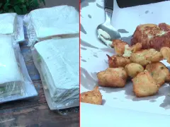 “Hemos preparado tortas saladas de pan de miga con variedades de sándwiches de pollo, de huevo, huevo y tomate, choclo, fiambre y queso, todo fresquito, excepto lo que van a ser los buñuelitos salados, que esos si van cocinados”.
