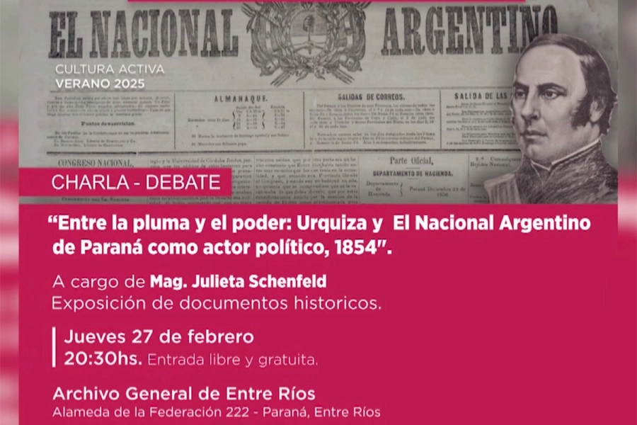 El Archivo General de Entre Ríos, dependiente de la Secretaría de Cultura provincial, organizará una conferencia titulada "Entre la pluma y el poder: Urquiza y El Nacional Argentino de Paraná como actor político, 1854". La charla se llevará a cabo el jueves 27 de febrero a las 20.30 en la sede del Archivo, ubicada en Alameda de la Federación 222, en la ciudad de Paraná. La actividad es libre y gratuita.