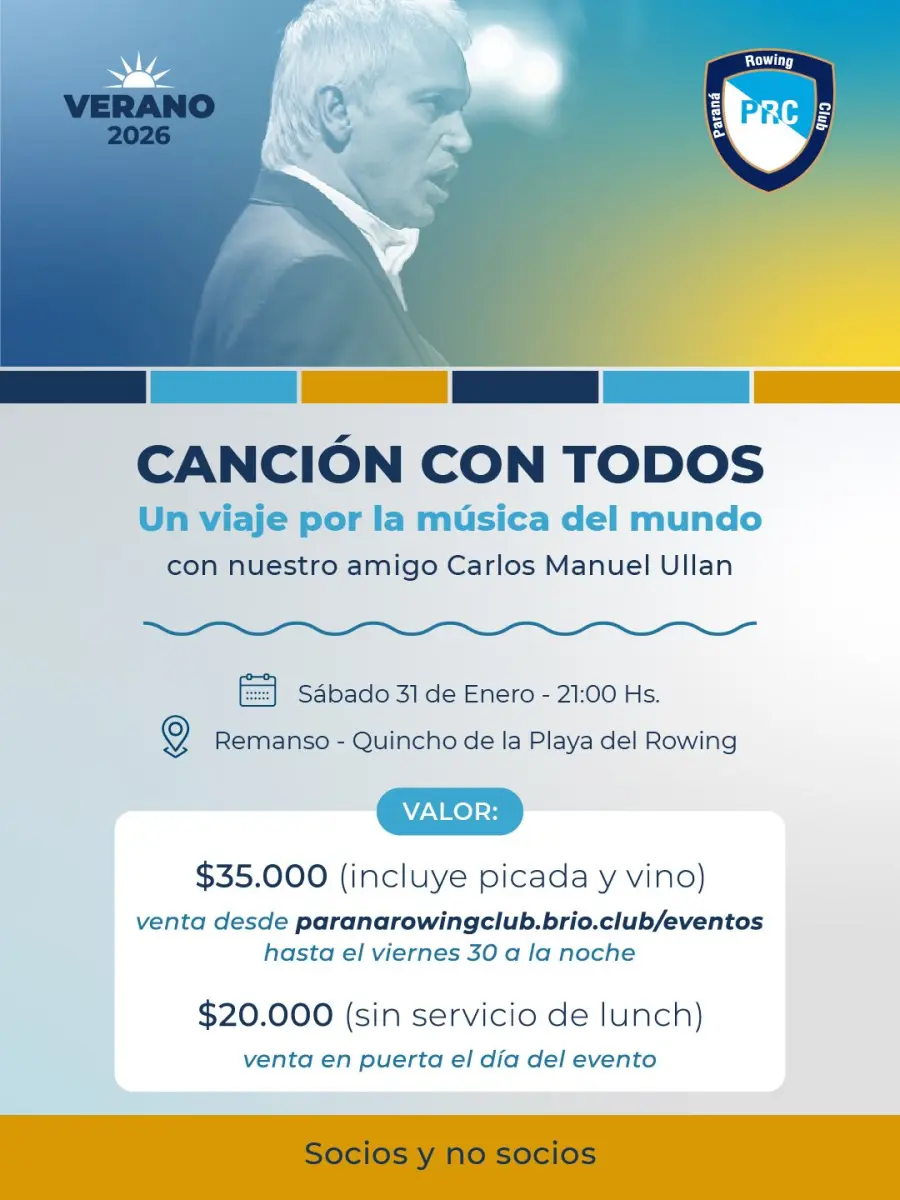 El tenor lírico Carlos Manuel Ullán será el protagonista de una nueva propuesta cultural del Rowing. El sábado 31 de enero, a las 21 horas, presentará "Canción con Todos", un viaje musical por el mundo que tendrá lugar en el quincho El Remanso, en la playa del PRC.