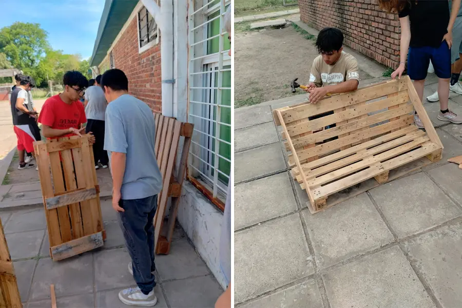 Los estudiantes de los cursos 3A, 4B y 5B del turno tarde fueron los encargados de realizar los trabajos prácticos, utilizando palets donados para la construcción de tres bancos. A futuro, el proyecto se expandirá con la fabricación de cestos de residuos, lo que permitirá seguir mejorando los espacios recreativos y de trabajo al aire libre de la escuela.