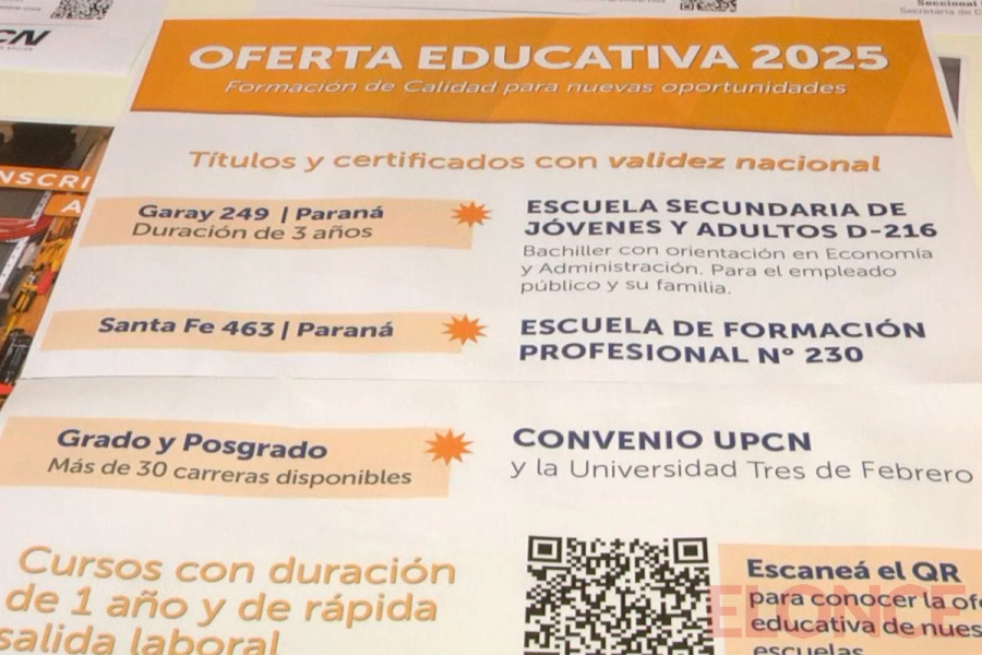 El gremio UPCN informó que se encuentran abiertas las inscripciones en sus tres instituciones educativas de Paraná y Nogoyá. Las escuelas, que están certificadas bajo normas de calidad IRAM, ofrecen una amplia variedad de cursos en 11 oficios. Entre ellos se encuentran el cuidado gerontológico, soldadura, gasista domiciliario, electricista domiciliario, manejo de paquete office e inteligencia artificial, entre otros.