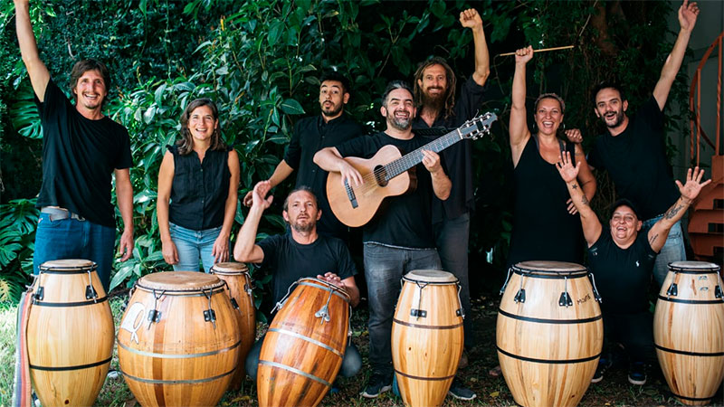 A las melodías de guitarra y punteos la refuerzan ocho tambores de candombe afrouruguayo, ejecutados por los más sólidos y experimentados tocadores de la ciudad, aportándole gran potencia y rítmica a la propuesta, desplegando ritmos variados desde el autóctono “Matecito”, a distintos ritmos internacionales como la samba brasileña, funk, joropo, baião, maracatú, cumbia, candombe y ritmos de creación propia como el merenguendombe, el candombe en 7 y el matecito doble tresillo.