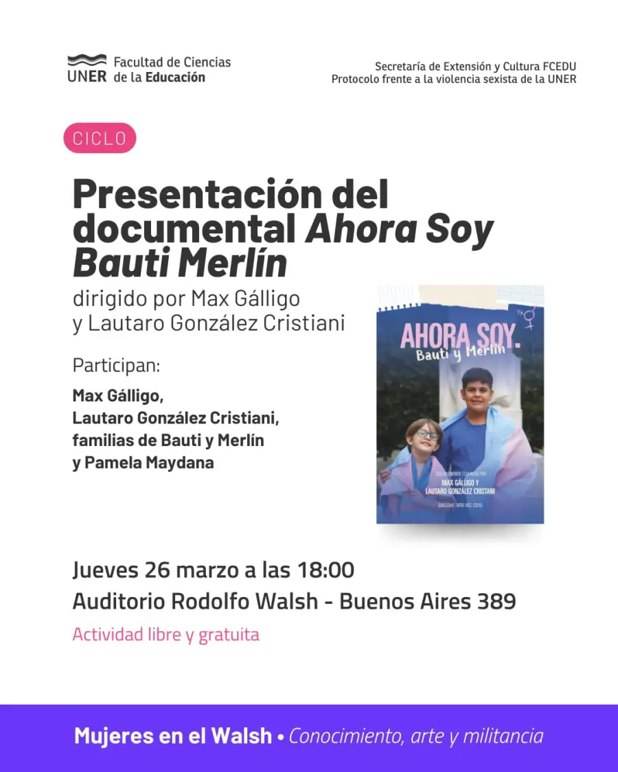 Proyectarán el documental "Ahora Soy Bauti y Merlín", una conmovedora historia sobre el proceso de dos infancias trans, Bautista y Merlín, que deciden ser quién quieren ser a muy temprana edad. Será este jueves a las 18 en el auditorio de la Facultad de Ciencias de la Educación (UNER), de calle Buenos Aires 389 en Paraná.