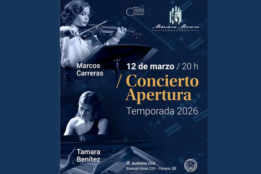La Asociación Mariano Moreno inaugurará su temporada cultural 2026 con un concierto del joven violinista Marcos Carreras, que se realizará el miércoles 12 de marzo a las 20 horas en el Auditorio de la UCA Paraná.