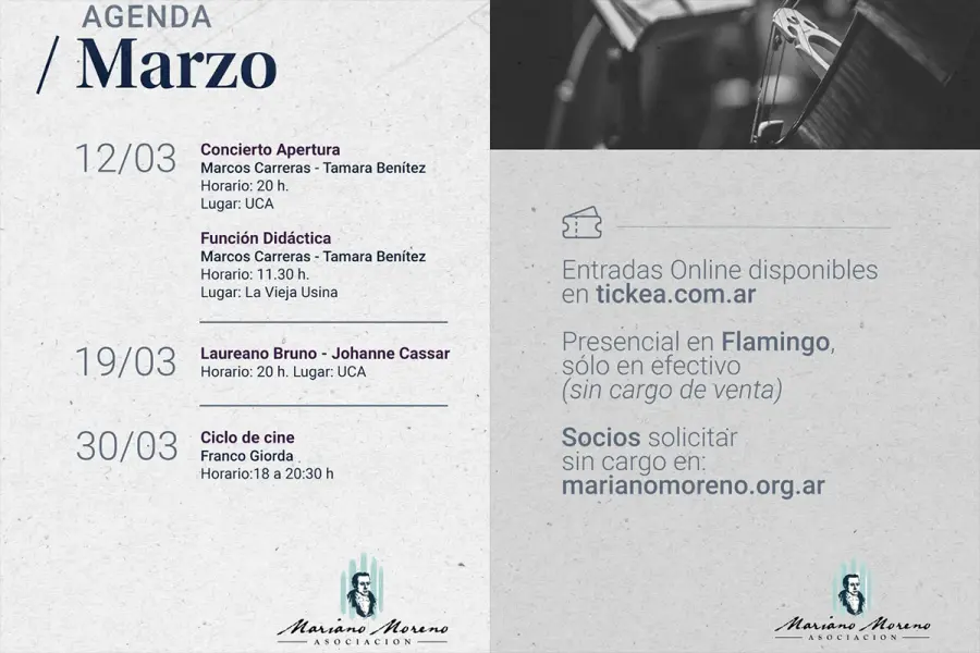 El concierto marcará el inicio de una nueva programación anual de la institución, dedicada a la difusión de la música, el arte y la literatura en la ciudad. Las entradas ya se encuentran disponibles y la información para su adquisición puede consultarse en marianomoreno.org.ar y en las redes sociales de la institución.