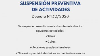 A través del Decreto Nº 132/2020 con fecha del día lunes 24 de agosto, "se suspende preventivamente durante siete días a partir de la fecha del dictado de la presente disposición, de las siguientes actividades o rubros: a) bares; b) gimnasios y actividades Físicas en ambientes cerrados; c) reuniones familiares y sociales; d) cultos religiosos".